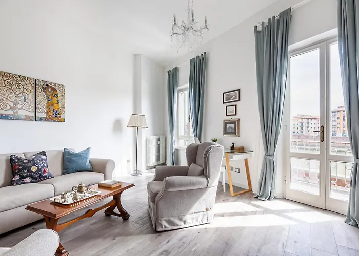Lungarno Elegant Apartment With Panoramic Balcony appartement|Lungarno Elegant Apartment With Panoramic Balcony biedt gasten toegang tot een balkon en een zitruimte voorzien van airconditioning, en moderne gemakken zoals een flatscreen TV met satellietzenders. De accommodatie is ook ingericht met een bureau. Het 2-badkamer appartement bestaat uit 2 slaapkamers. 2 badkamers hebben een bidet, een apart toilet en een douche, plus een haardroger en handdoeken.